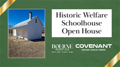 Come join the Friends of the Historic Welfare Schoolhouse Board, Boerne Paint Co. and Covenant Development Group on Saturday, February 14th, 2026, from 1PM-3PM to learn about the project, connect with your neighbors, and go back in time to a piece of Hill Country history!